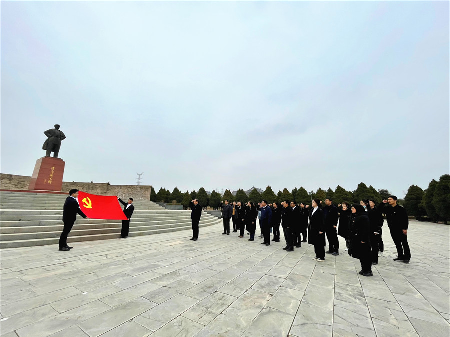 在死难烈士纪念碑前,郭春耀主持了敬献花篮仪式,院领导带领大家绕行瞻仰烈士纪念碑,重温中国共产党波澜壮阔的奋斗历程。在徐向前将军铜像前,吉育峰带领全体党员,面向党旗,紧握右拳,庄严宣誓:“我志愿加入中国共产党,拥护党的纲领,遵守党的章程……为共产主义奋斗终身,随时准备为党和人民牺牲一切,永不叛党。”