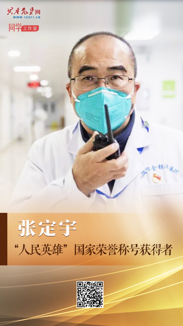 张定宇,男,汉族,中共党员,1963年12月生,河南确山人,湖北省卫生健康委员会副主任、武汉市金银潭医院院长。他长期在医疗一线工作,曾带队赴汶川抗震救灾,多次参加国际医疗援助。2019年12月29日,在收治首批7名不明原因肺炎患者后,他立即组建隔离病区,率先采集样本开展病毒检测,组织动员遗体捐献,为确认新冠病毒赢得了时间,为开展新冠肺炎病理研究创造了条件。作为渐冻症患者,他冲锋在前,身先士卒,带领金银潭医院干部职工共救治2800余名新冠肺炎患者,为打赢湖北保卫战、武汉保卫战作出重大贡献。荣获“全国卫生健康系统新冠肺炎疫情防控工作先进个人”称号。